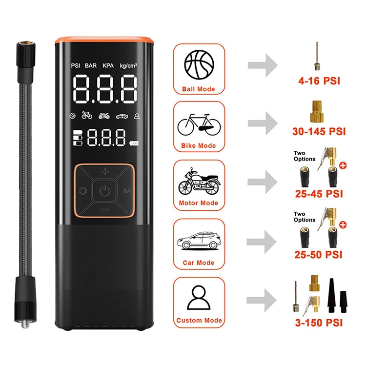Presio-unitateak: PSI, KPA, BAR, KG/CM² eta aurrez ezarritako lau inflazio-modu. Aurrez ezarritako lau moduen presioa zure ibilgailuaren arabera ezar dezakezu. Aire-ponpa hau egokia da: